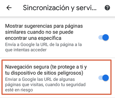 - Activa la opción de “Navegación segura (te protege a ti y a tu dispositivo de sitios peligrosos).”